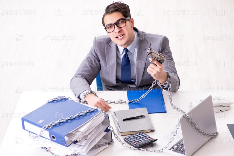 Загруженный сотрудник прикован цепями к своему офисному столу