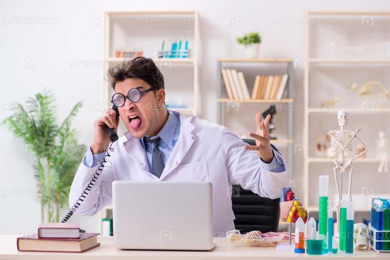 Смешный врач, развлекающийся в больничной лаборатории