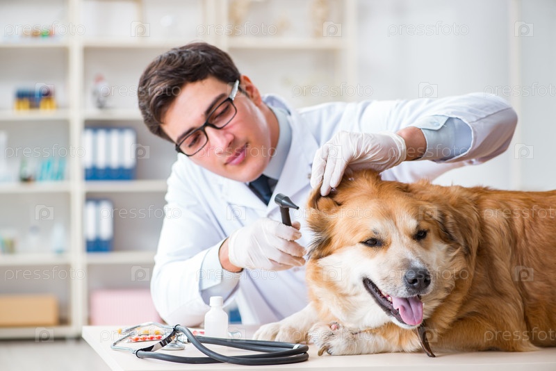 Врач осматривает собаку золотого ретривера в ветеринарной клинике