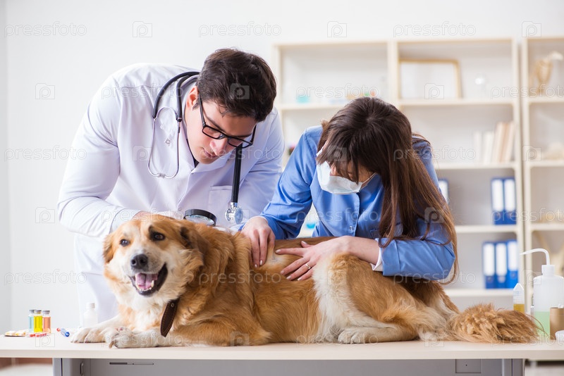 Врач и его помощник проверяют золотого ретривера в клинике ветеринара