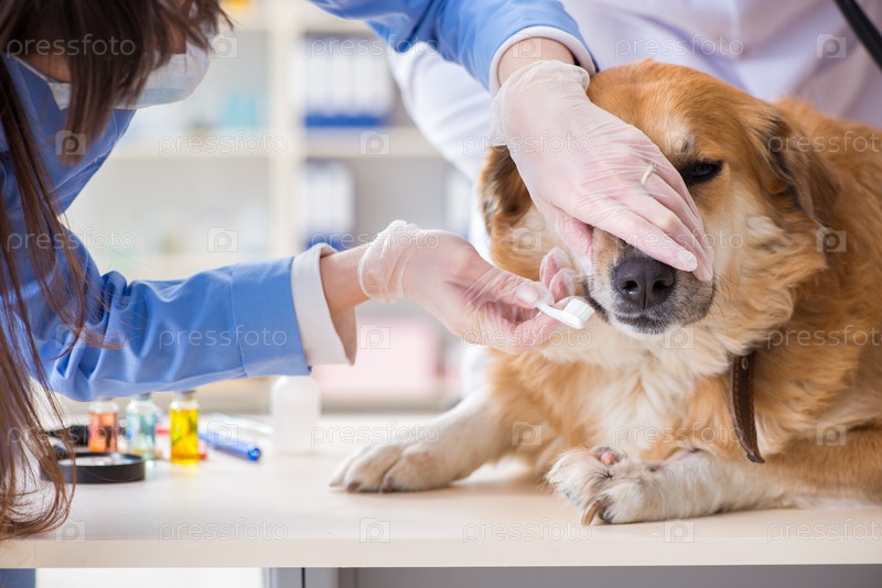 Врач и его помощник проверяют золотого ретривера в клинике ветеринара