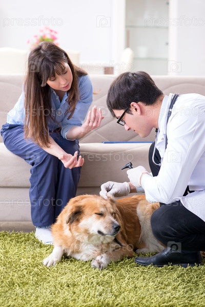Ветеринар посещает золотого ретривера собаку дома