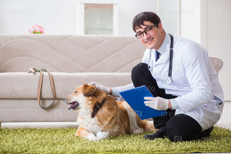 Ветеринар осматривает золотого ретривера собака на домашнем посещении