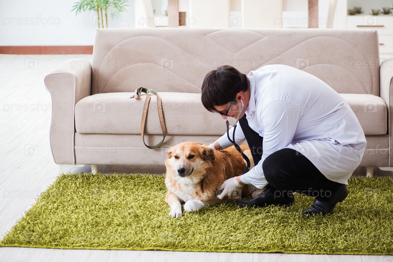 Ветеринар осматривает золотого ретривера собака на домашнем посещении