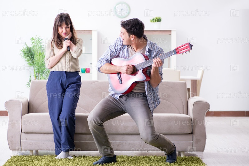 Молодая семья поет и играет на музыке дома