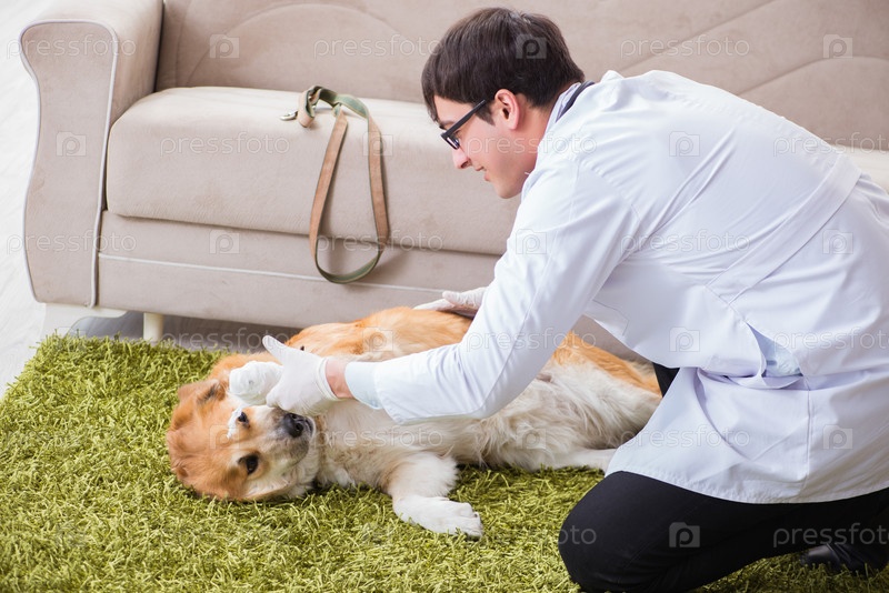 Ветеринар осматривает золотого ретривера собака на домашнем посещении