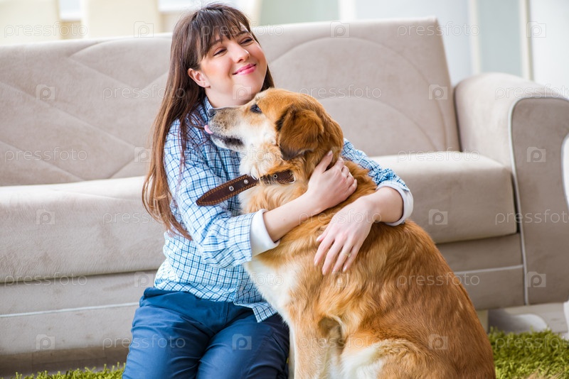 Счастливая женщина-хозяин собаки дома с золотым ретривером