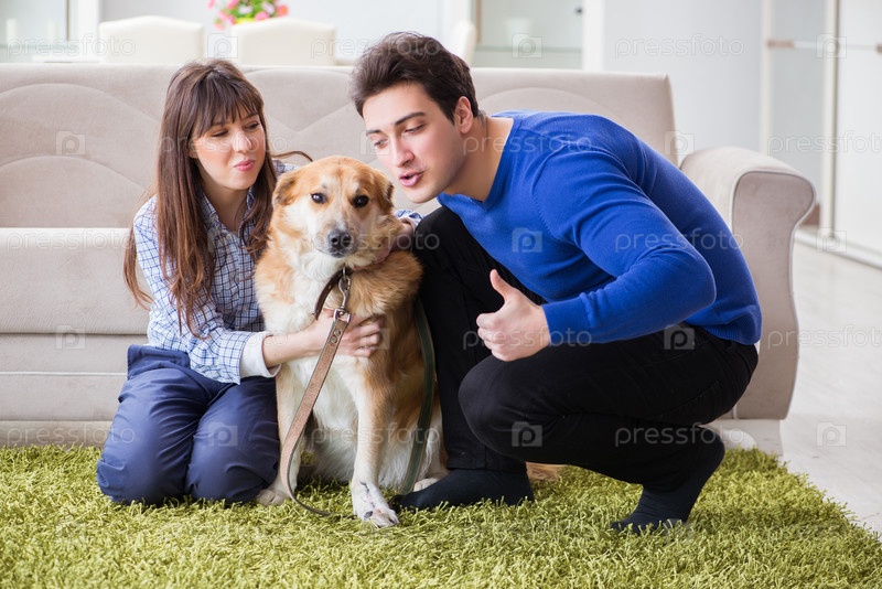Счастливая семья с собакой золотого ретривера