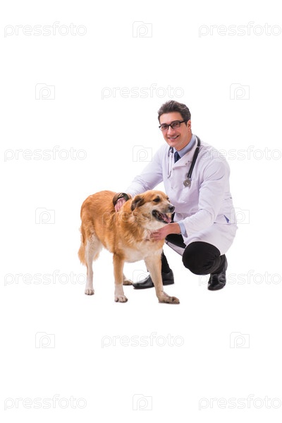 Ветеринар осматривает золотого ретривера собака изолирована на белом
