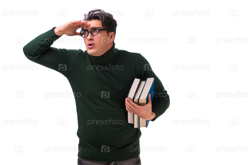 Нерд молодой студент с книгами, изолированными на белом