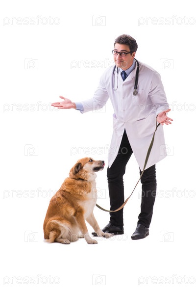 Ветеринар осматривает золотого ретривера собака изолирована на белом