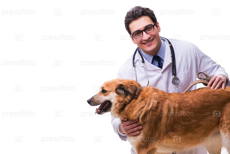 Ветеринар осматривает золотого ретривера собака изолирована на белом