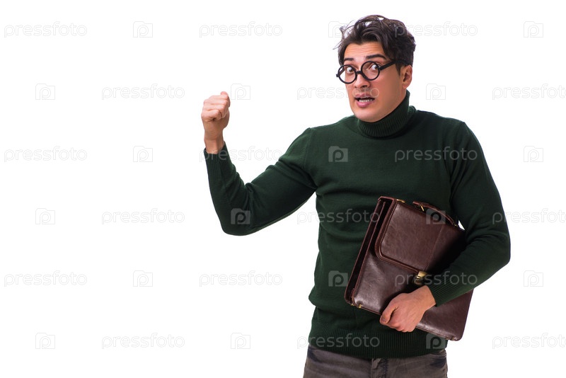 Нэрд-бизнесмен с портфелем, изолированным на белом