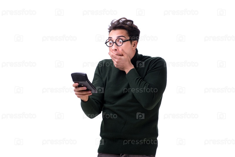 Нэрд молодой человек с калькулятором, изолированный на белом