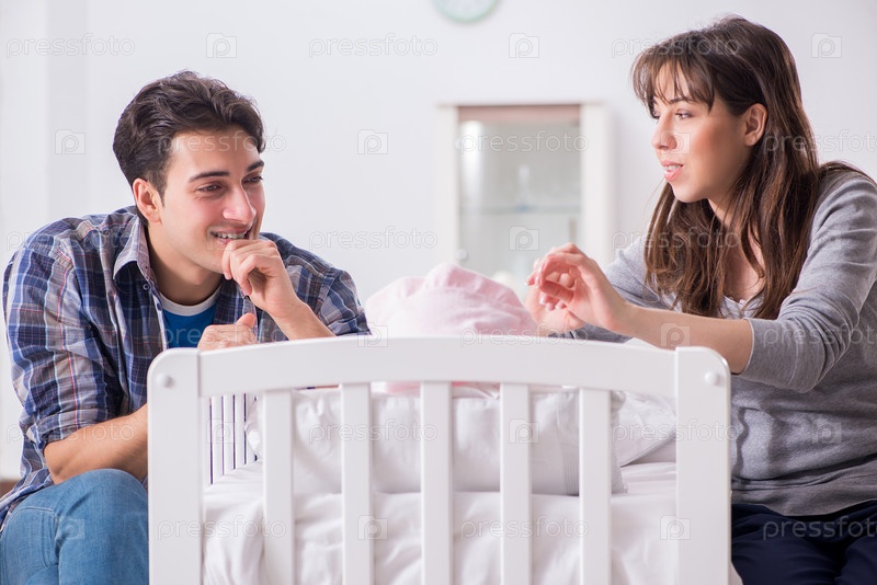 Молодые родители со своим новорожденным рядом с кроваткой