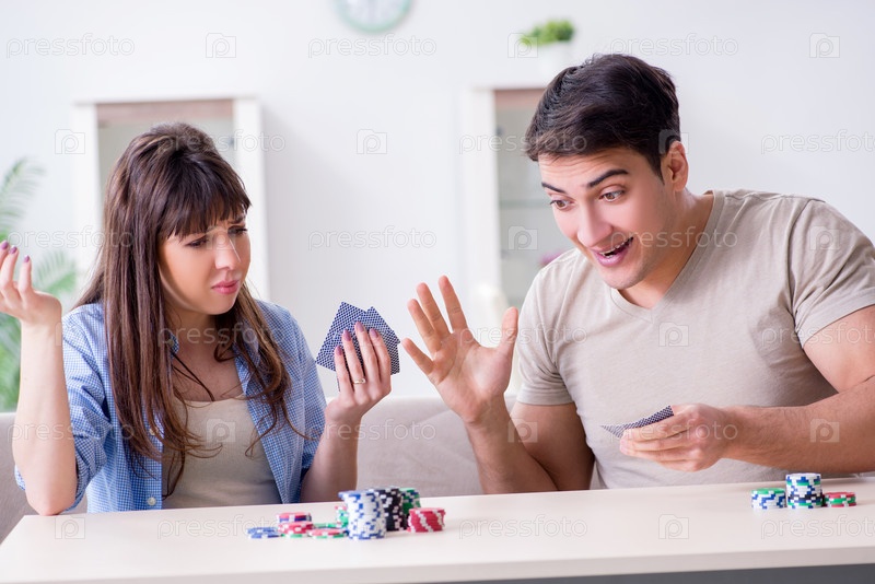 Молодая семья играет в карты дома