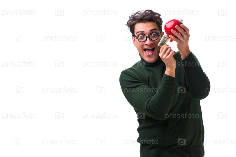 Нерд молодой человек с пиггибанком изолированный на белом
