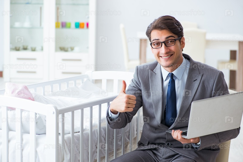 Молодой бизнесмен пытается работать из дома, заботясь о новорожденном ребенке