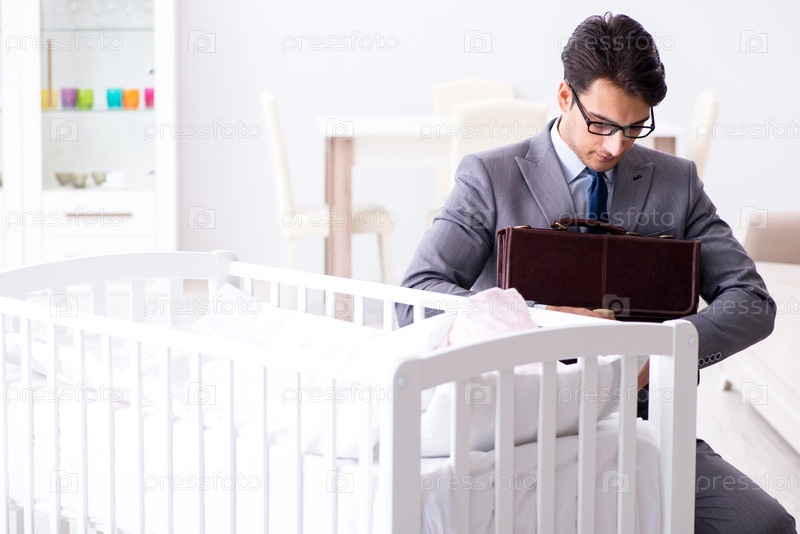 Молодой бизнесмен пытается работать из дома, заботясь о новорожденном
