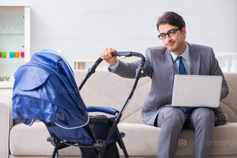 Бизнесмен, который ухаживает за новорожденным ребенком дома и работает на расстоянии
