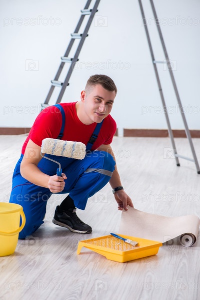 Работник-подрядчик готовится к оформлению обоев