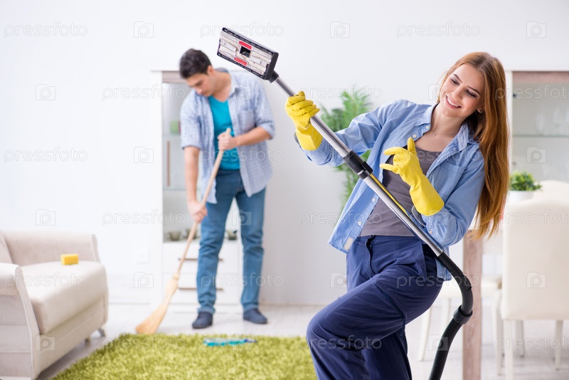 Молодая семья убирает дом
