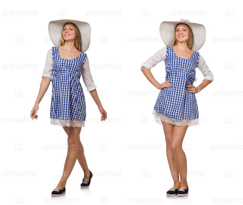 Улыбающаяся женщина в квадратном простом платье и шляпе изолирована на белом