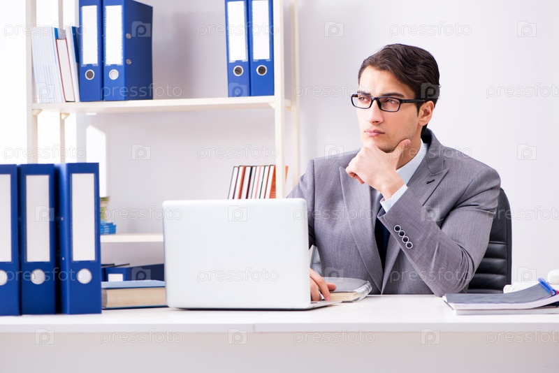 Молодой привлекательный бизнесмен-сотрудник, работающий в офисе за столом