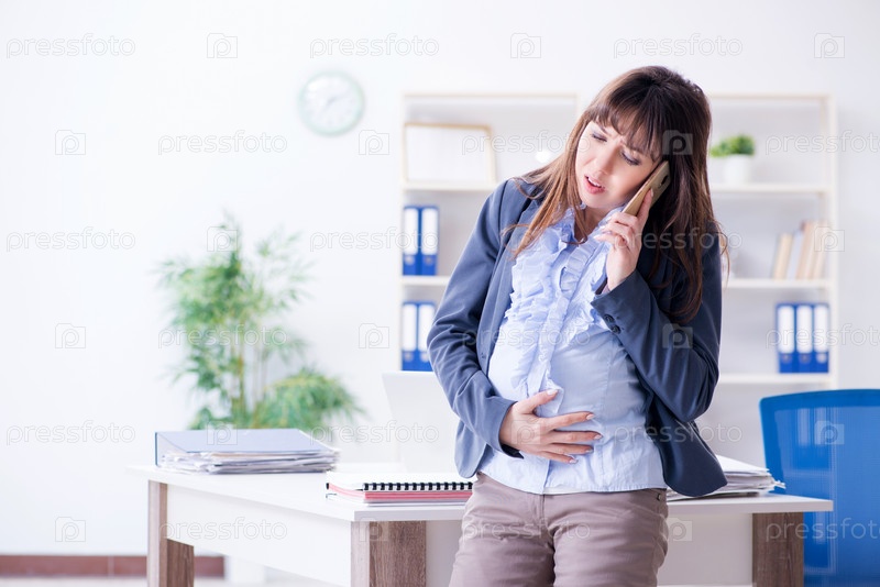 Беременная женщина изо всех сил пытается работать в офисе
