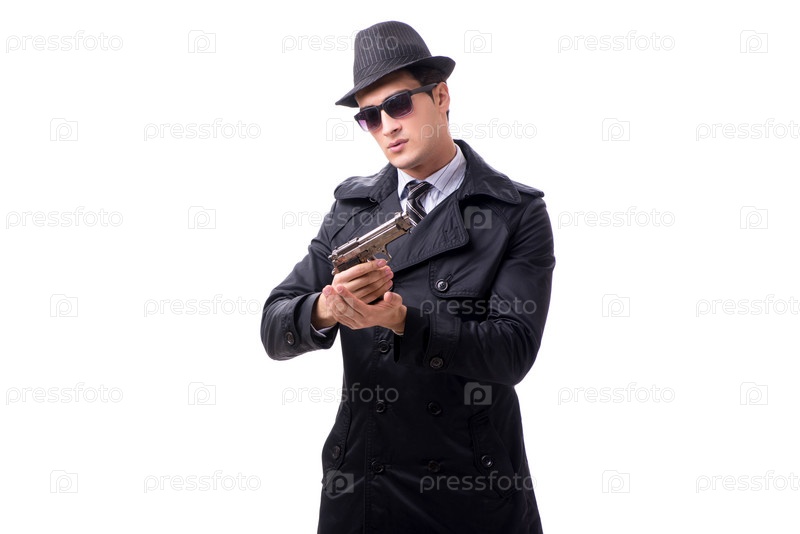 Мужчина-шпион с пистолетом изолирован на белом фоне