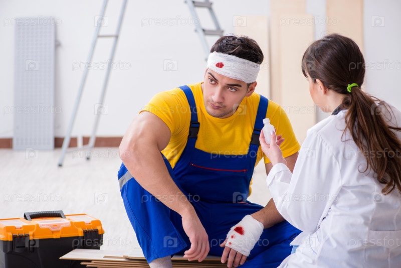 Работник с травмированной головой и врач