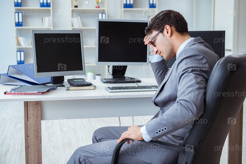Бизнесмен сидит перед множеством экранов
