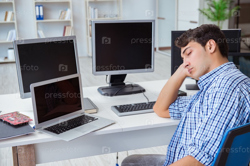 Бизнесмен сидит перед множеством экранов