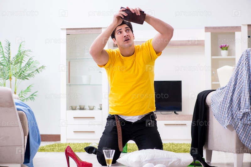 Мужчина с беспорядком дома после вечеринки в доме