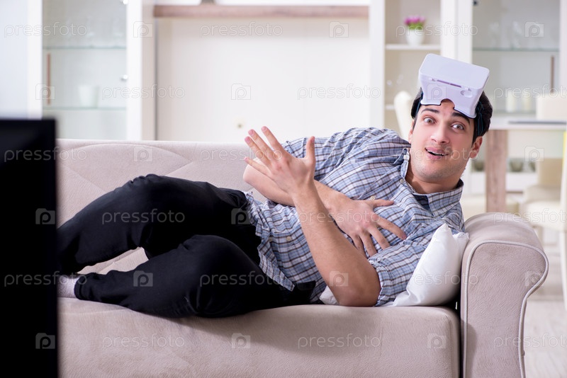 Мужчина смотрит на очки виртуальной реальности дома