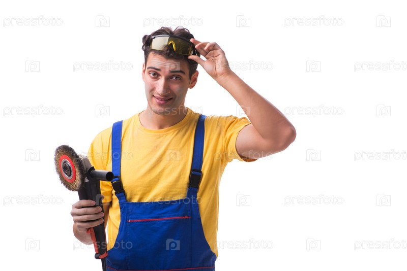 Сотрудник подрядчика со шлифовальником, изолированным на белом фоне