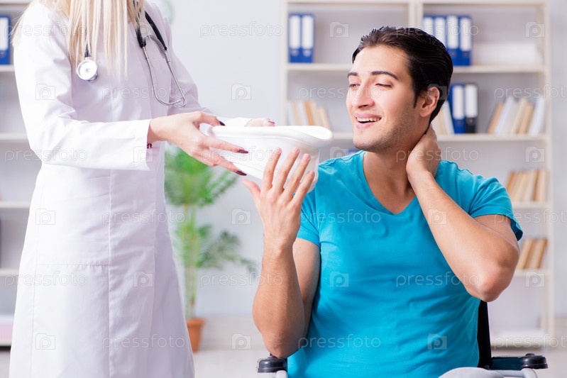 Инвалид в инвалидном кресле посещает женщину-врача