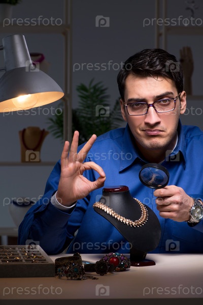 Ювелир работает в своей мастерской поздно ночью