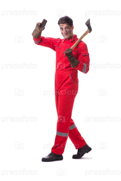 Сотрудник подрядчика с топором на белом фоне