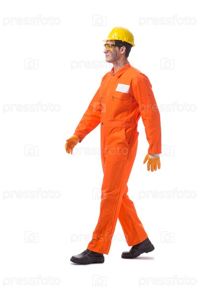 Сотрудник подрядчика в комбинезонах, изолированных на белом