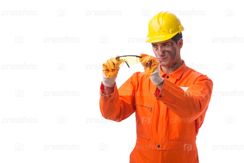 Сотрудник подрядчика в комбинезонах, изолированных на белом