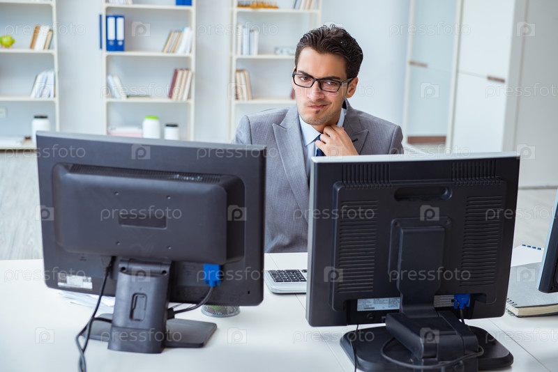 Бизнесмен сидит перед множеством экранов