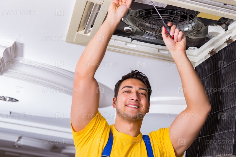 Ремонтник, ремонтирующий потолок кондиционера