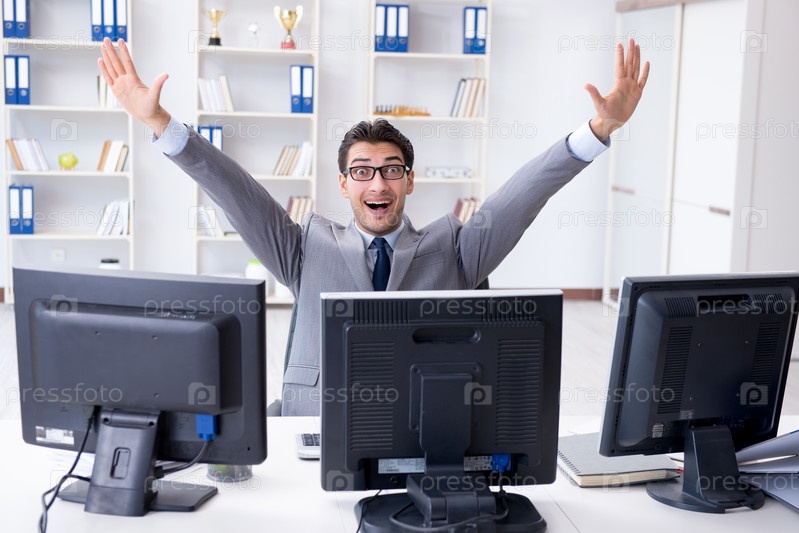 Бизнесмен сидит перед множеством экранов