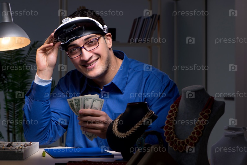Ювелир работает в своей мастерской поздно ночью