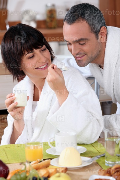 Женщина дает чайную ложку йогурта мужу на завтрак, оба одеты в халаты