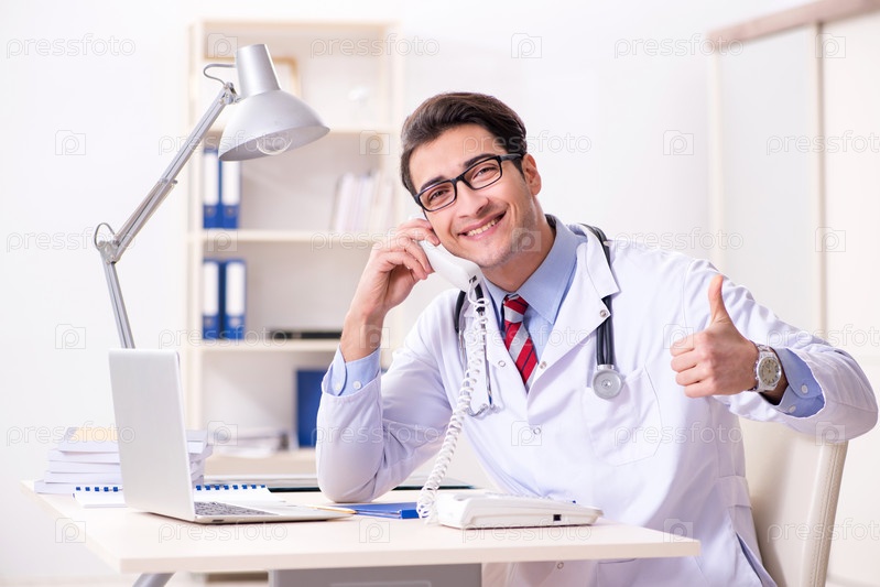 Молодой красивый врач работает в больничной палате