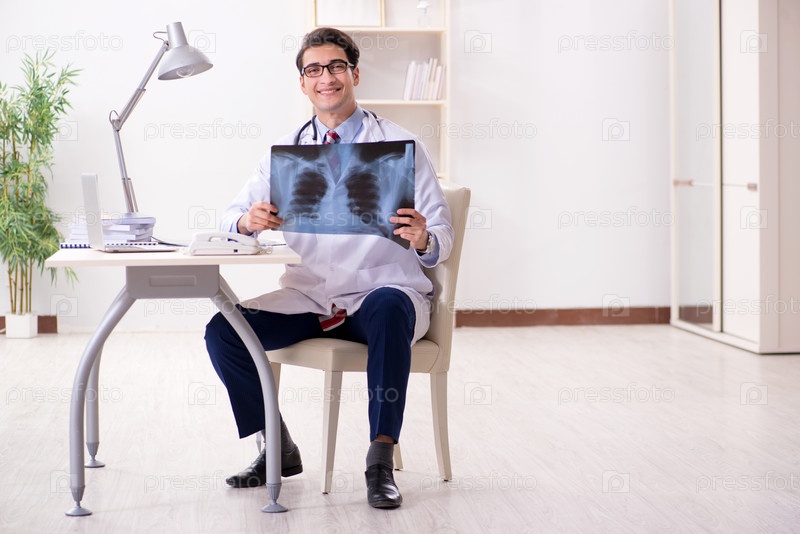 Молодой красивый врач работает в больничной палате
