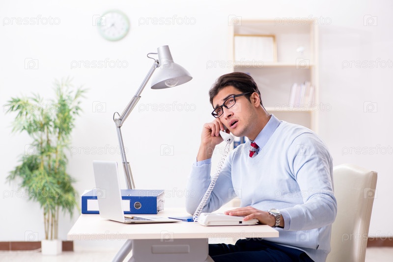 Работник бизнесмена разговаривает по офисному телефону