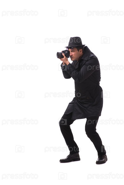Шпион с камерой снимает изолированные фотографии на белом фоне